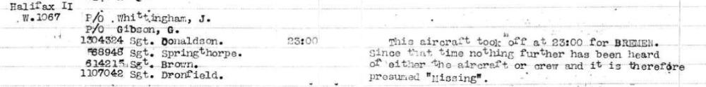 Pilot Officer J A Whittingham, Sergeant H Dronfield: killed; Sergeant G Gibson, Sergeant D B Donaldson, Sergeant A Springthorpe, Sergeant R A Brown: