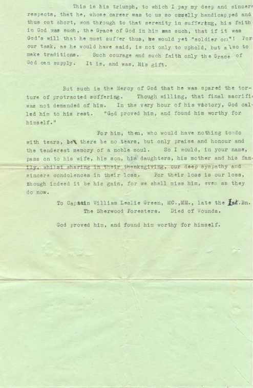 To Captain William Leslie Green, MC, MM, late the 1st Bn. The Sherwood