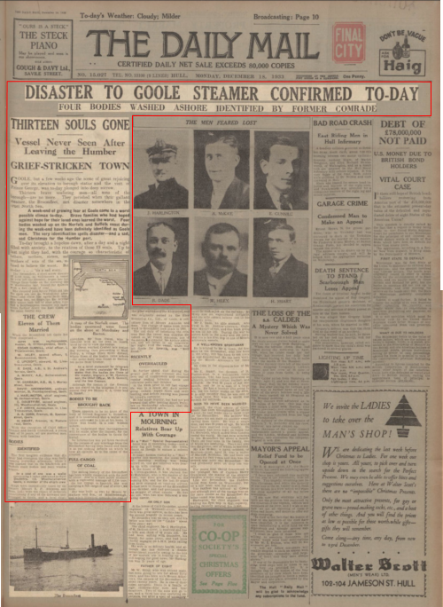 DISASTER TO GOOLE STEAMER CONFIRMED TO-DAY