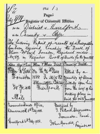 When and Where Died : On the 16th June 1888 In No 15 Pit Skerrington Colliery Hurlford Cause of Death : Killed by a quantity of Stones falling upon him from the roof of his working place in said pit on 16th June.