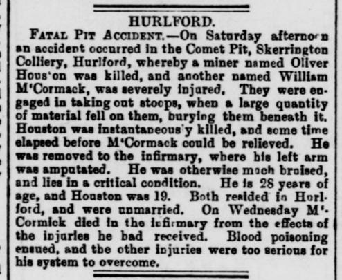 A colliery oversman (or overman) was a senior underground official in a coal mine responsible for the daily supervision of mining operations, acting as a foreman or manager. They were typically experienced miners who oversaw safety, managed the work of colliers (miners) and deputies, and reported directly to an undermanager.    Key Responsibilities: •	 Supervision: They supervised an entire shift's work, often with one oversman per shift. •	 Safety Inspection: Responsible for conducting safety inspections and ensuring ventilation was maintained. •	 Production Management: Managed the daily production and coal output, setting up work for miners each morning. •	 Hierarchy: Located in the chain of command, they were superior to deputies and firemen, but subordinate to the manager (or viewer). Death : Oliver McLeod Houston : 16 Jun 1888