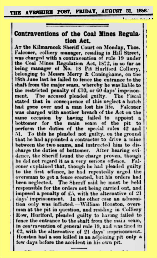On 18 Jun 1888 at Hurlford No 18 Pit, Thomas Woods, a miner aged 27 fell after his hutch down the shaft from an unfenced midworking.