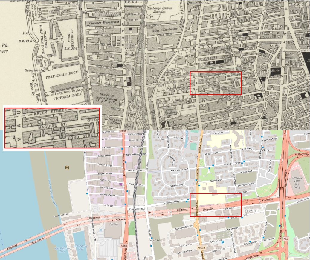 The Rowland family were living in Maguire St from about 1829. The Victorian map shows its location. The modern map indicates Maguire St disappeared