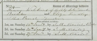 At the age of 26 Henry Wilkins, a servant, married Eliza Findley on 5 Feb 1861 in the parish of Appleby after Banns read in the parish church.