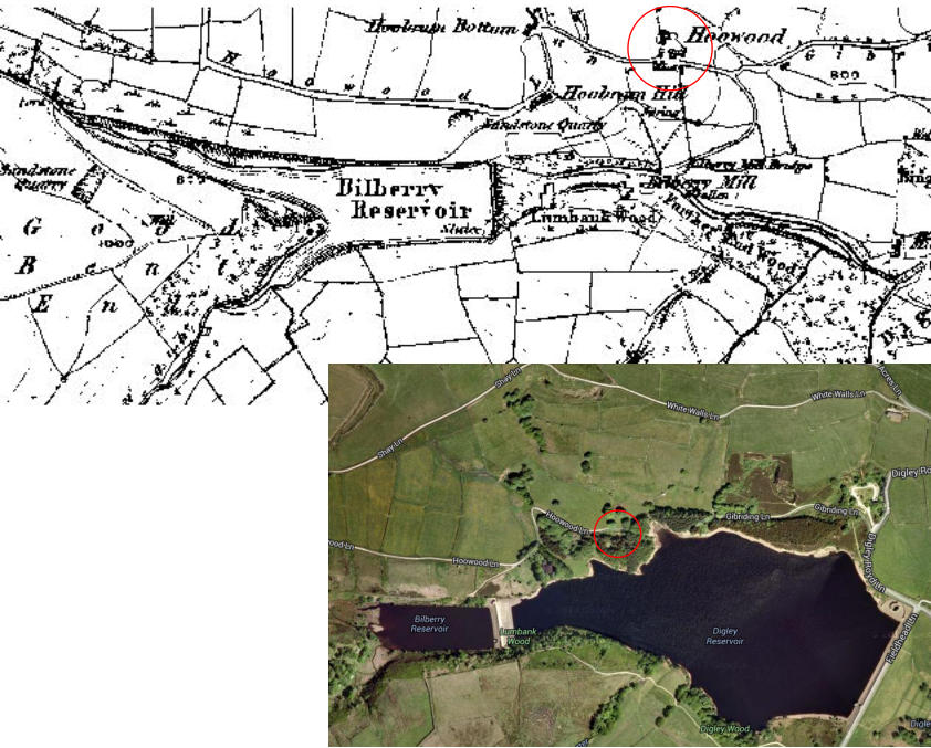 Bilberry Reservoir was constructed in 1840. The top map shows area around Bilberry Reservoir around the time of 1852 flood.