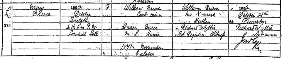 William and Grace Bruce produced their sixth child, Mary Bruce, a little over a year later. William Bruce, coal miner, was named as the father and