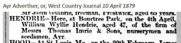 until his death of catarrhal pneumonia in 1879. Apart from the links to someone named Bruce this William Wyllie Hendrie has the wrong profession to