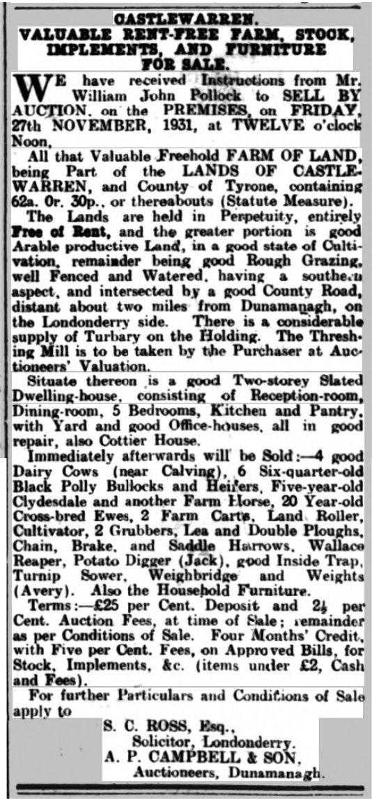 A Castlewarren farm was put up for sale by a William John Pollock in