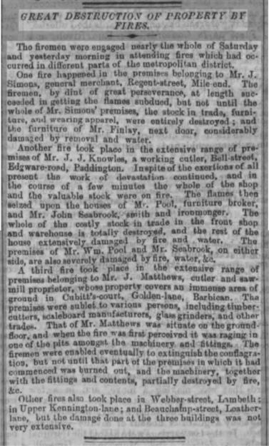 The birth locations and the newspaper cutting referring to the fire in 1856 on the premises of Mr John Seabrook, smith and ironmonger, in "Bell-street,