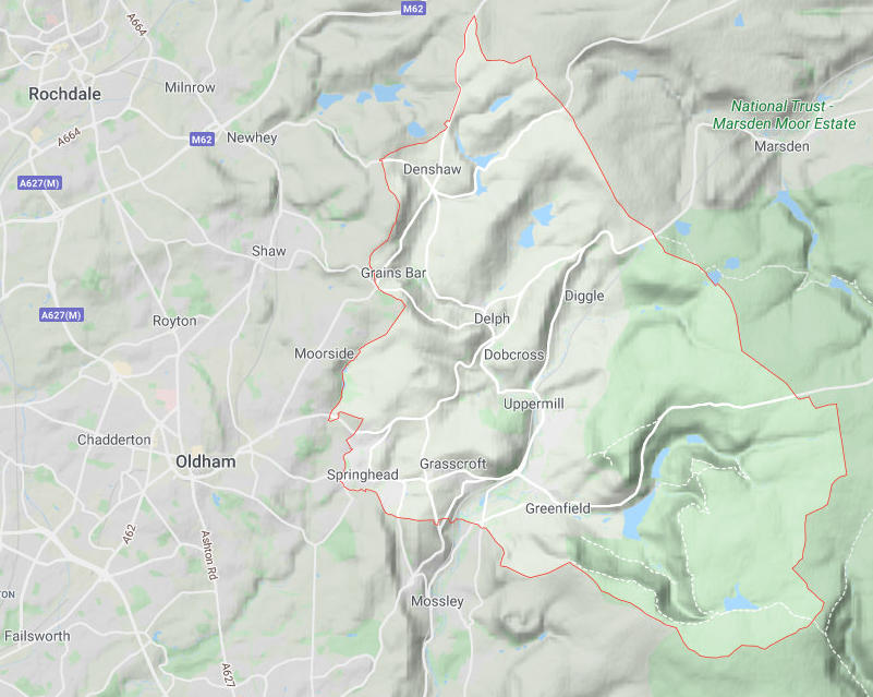 and Greenfield can be found in the valleys, and towards Oldham, the more urban villages of Scouthead, Austerlands, Friezland, Grasscroft, Lydgate,